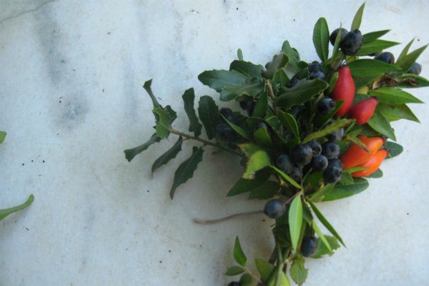 Γιατί πρέπει το χριστουγεννιάτικο στεφάνι μας να είναι αγοραστή απομίμηση των αγγλοσαξονικών; Θα μου πείτε, όλη μας η γιορτινή διακοσμητική παράδοση έρχεται από τη Δύση, αυτήν συνηθίσαμε κι αυτήν περιμένουμε κι εμείς και τα παιδιά μας. Η προσπάθεια της (επανα)εισαγωγής του καϊκιού μάλλον απέτυχε. Καλώς ή κακώς, το στολισμένο δέντρο και τα πράσινα κλαδιά με κόκκινους καρπούς μας είναι γνώριμα και αγαπητά. Αυτό δεν σημαίνει ότι πρέπει να καταφύγουμε στις ψεύτικες επινοήσεις των ανθοπωλείων με τις φτιασιδωμένες κουκουνάρες. Με μηδέν έξοδα και λίγο κόπο μπορούμε να φτιάξουμε ένα στεφάνι με τα κοινότατα φυτά που βρίσκουμε γύρω μας. Είναι τα άγρια φυτά της Μεσογείου που αφθονούν στην ελληνική εξοχή. (Και μη μου πείτε «Μα εγώ μένω στην πόλη!». Μια ώρα στην πιο κοντινή πλαγιά – την Καισαριανή ας πούμε για τους Αθηναίους – θα σας εξασφαλίσει υπεραρκετό υλικό). Τέτοια εποχή οι θάμνοι είναι καταπράσινοι και καρποφορούν.