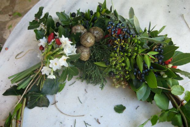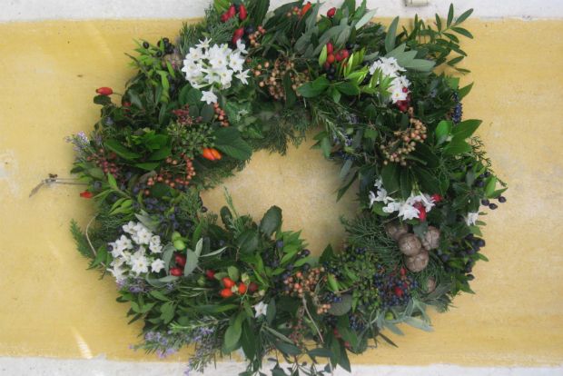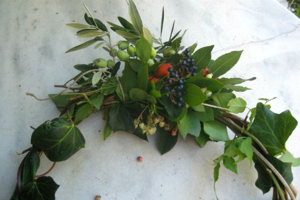 Καθώς έφτιαχνα προχτές το γιορτινό στεφάνι μου μ’ όλα τα φυτά της κερκυραϊκής εξοχής, με τριγύριζαν σκέψεις για τον συμβολισμό τους και οι σημαδιακοί στίχοι της Ωδής του Κάλβου. Φέτος δεν μας αξίζει «νικητήριος δάφνη», αυτό είναι σίγουρο, αλλά και ούτε για «μυρτιά και πένθιμο κυπάρισσο» είμαστε ακόμα… Έτσι, λοιπόν, για να αλληλοεξουδετερώνονται όλες οι συμβολικές σημασίες τα έχωσα όλα μέσα, και τα αγριοτριαντάφυλλα γι’ αγάπη, και τη λεβάντα για προστασία, και το δεντρολίβανο για πίστη και ενθύμηση, και το φασκόμηλο για σοφία και την ελιά για ειρήνη… σε καλό μας!