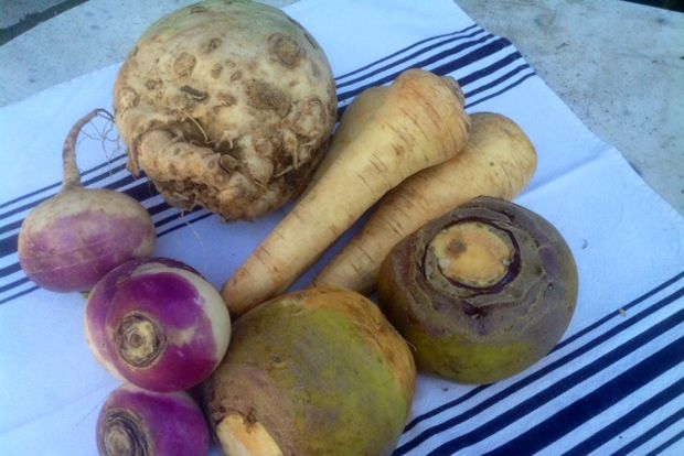 - ό,τι σας βρίσκεται από: καρότα, σελινόριζα, ρέβες, γλυκοπατάτες, πάρσνιπ, swede, κολοκύθα (δεν είναι ρίζα βέβαια, αλλά ταιριάζει), καθαρισμένα και κομμένα σε κομμάτια ανάλογου μεγέθους