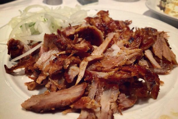 Αφού είχαμε μονομαχία για το τελευταίο (5 έχει βλέπεις η μερίδα), παραγγείλαμε τη δεύτερη. Στο μεταξύ έφτασε ο γύρος. Σούπερ ντούπερ, ζουμερός και τραγανός μαζί, ο καλύτερος που έχω δοκιμάσει χωρίς υπερβολές – και έχω δοκιμάσει μπόλικους. Λουρίδες μαλακές και άλλες ξεροψημένες, καμία σχέση με τους λιπαρούς και ογκώδεις που βλέπεις στα περισσότερα σουβλατζίδικα περπατώντας (κι είναι βέβαια όλοι αυτοί οι γύροι που έχουν κατακλύσει τα μαγαζιά, κατεψυγμένοι εισαγόμενοι εκ Γερμανίας). Εδώ είναι χειροποίητος, φτιαγμένος από τους ίδιους και τούτο το καταλαβαίνεις και από την όψη και από τη γεύση του. Ούτε σ’αυτόν στολίδια στο σερβίρισμα, παρά μόνο λίγο κρεμμύδι ψιλοκομμένο στο πλάι, ό,τι δηλαδή τον ακομπανιάρει σωστά.