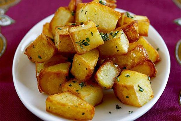 Αναστασία Λαμπρία ακολουθεί και οι κυρίες του σπιτικού της. Στην αρχή κομμένες σε κύβους, βρασμένες και χτυπημένες για να σπάσουν οι άκρες τους (όσο πιο σπασμένες, τόσο πιο τραγανές μετά) και τέλος πέρασμα από τον φούρνο με πιπέρι, ρίγανη, δεντρολίβανο. Βρείτε μου έναν, έστω έναν, που να μπορέσει να τους αντισταθεί!