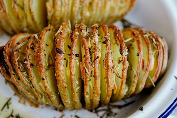 Τελευταίες μα όχι έσχατες τούτες οι ψητές, κομμένες σαν πτυχές βεντάλιας, να θυμίζουν τσιπς μα με λίγη παραπάνω δελεαστική ψίχα. Γνωστές ως “Hasselback potatoes”, μυρωδάτα πατατάκια που, τσίμπα – τσίμπα, ούτε πηρούνι δεν λερώνεις για χάρη τους.