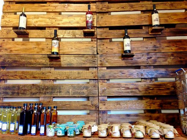 Μπαίνοντας μέσα μύρισα όλες τις μυρωδιές της Κρήτης, βότανα, τυριά, κρασιά, ξύλο, λάδι, όλα μαζί και το καθένα ξεχωριστά. Αμέσως μετά συνειδητοποίησα ότι είναι διακοσμημένο από ανακυκλώσιμα υλικά και κυρίως παλέτες, καλοδουλεμένες, γουστόζικες που δένουν μαγικά με την παράδοση.