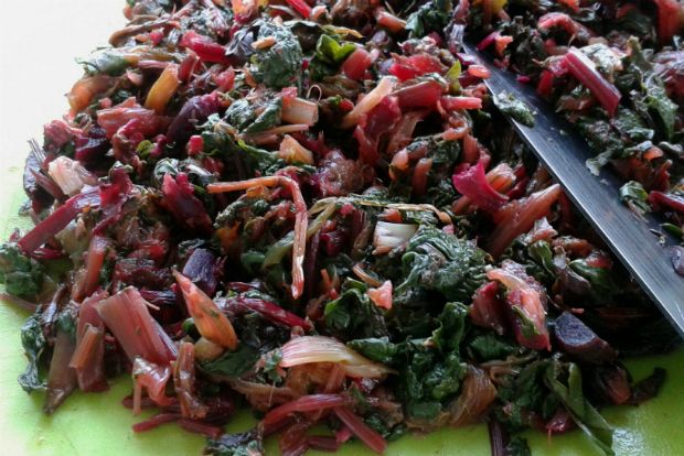 Κόβουμε τα φύλλα από τα παντζάρια χωρίζοντας τα κοτσάνια από τα φύλλα. Βράζουμε τα κοτσάνια μόνα τους μέχρι να αρχίσουν να μαλακώνουν. Τότε προσθέτουμε τα φύλλα. Σε 2-3 λεπτά τα κατεβάζουμε από τη φωτιά και τα μεταφέρουμε σε τρυπητό. Τα πιέζουμε με χαρτί κουζίνας για να φύγουν τα νερά και τα ψιλοκόβουμε.