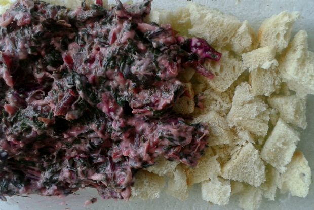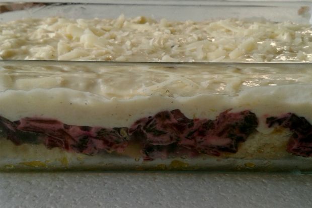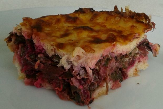 Ανακατεύουμε τα παντζαρόφυλλα με τη μισή μπεσαμέλ και ρίχνουμε το μείγμα πάνω από τη στρώση του ψωμιού. Καλύπτουμε με την υπόλοιπη μπεσαμέλ.
