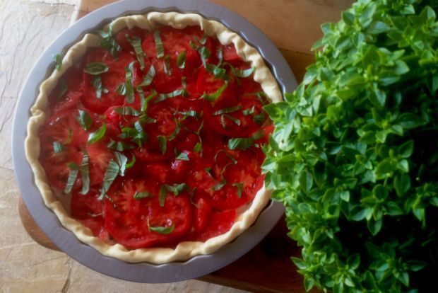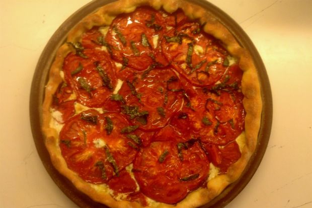 Πρώτα, για να μου φύγει η λαχτάρα, έκανα μια ντοματοσαλάτα μόνο με κρεμμύδι, λάδι και άνθος αλατιού και βούτηξα μέσα και φρέσκο χωριάτικο ψωμί. Στην επόμενη φάση θέλησα να μαγειρέψω και κάτι πιο ιδιαίτερο και αξιομνημόνευτο για να γιορτάσω επίσημα την έναρξη της σεζόν. Η έμπνευση ήρθε από ένα αστυνομικό μυθιστόρημα που διαβάζω τώρα. Η δράση εκτυλίσσεται στη Dordogne της Γαλλίας και ο επαρχιακός αστυνόμος-ήρωας κόβει κατακόκκινες ώριμες μυρωδάτες ντομάτες απ’ τον κήπο του και φτιάχνει μια τάρτα με ντομάτα και βασιλικό που νομίζεις ότι την μυρίζεις. Βέβαια εκείνος χρησιμοποιεί τυρί μασκαρπόνε και το περίφημο τοπικό Cantal, που δεν τα βρίσκω εδώ, αλλά αυτοσχεδίασα ένα μίγμα με Φιλαδέλφεια και Κοπανιστή που βγήκε τέλειο. Έτριψα μέσα και το τελευταίο μου πολύτιμο κομμάτι Αρσενικού Νάξου (αν δεν το ξέρετε, είναι το νοστιμότατο «in» τυρί). Τα σχοινόπρασα (chives) είναι άφθονα τώρα στον κήπο μου, οπότε έκοψα ένα ματσάκι και τα ανακάτεψα μέσα κι αυτά. Αν είχα περισσότερες ντομάτες θα τις είχα τοποθετήσει ελικοειδώς με κάθε φέτα να καλύπτει τη μισή προηγούμενη. Με ένα στρώμα μου βγήκε λίγο φτενή.