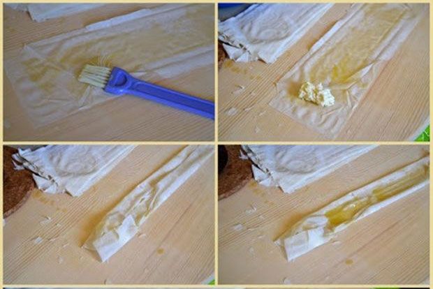 3)Δεν τυλίγουμε πολύ σφικτά τα μπουρεκάκια. Αφήνουμε ένα μικρό περιθώριο ειδικά στα δύο άκρα γιατί η γέμιση φουσκώνει ελαφρά και θα σπάσει το φύλλο αν είναι σφικτά τυλιγμένη.