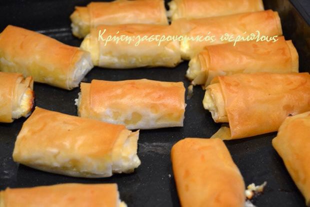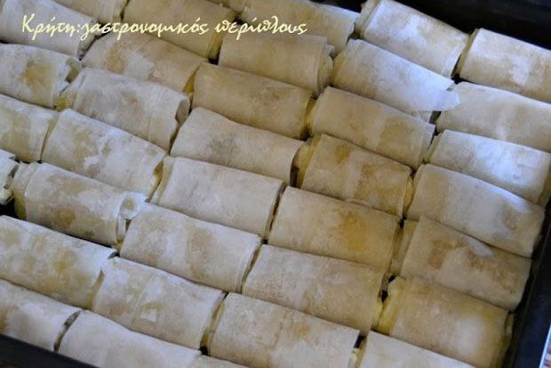 Τα αραδιάζουμε σε ελαφρά λαδωμένο ταψάκι. Όταν τελειώσουμε, αλείφουμε με λίγο λάδι την επιφάνειά τους και τα ψήνουμε σε προθερμασμένο φούρνο στους 180 βαθμούς περίπου 40 λεπτά ή μέχρι να χρυσίσουν (στη μεσαία σχάρα).