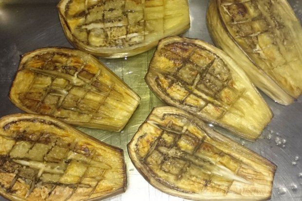 Κόβουμε τις μελιτζάνες στα δύο, κατά την μεγάλη διάσταση, τις χαράζουμε ραντίζουμε με ελαιόλαδο, πασπαλίζουμε με κόκκους χοντρό θαλασσινό αλάτι και τις βάζουμε στον φούρνο (200 βαθμούς Κελσίου) για να μαραθούνε. Μην τις αφήσετε περισσότερο από 15 λεπτά. Τρυπήστε τις με ένα πιρούνι και βεβαιωθείτε ότι είναι αρκετά τρυφερές, χωρίς να είναι λιωμένες. Οι μελιτζάνες στο φούρνο είναι πολύ ελαφριές σε σχέση με το τηγάνι, και κατά τη γνώμη μου αναδεικνύουν την γεύση της μελιτζάνας πολύ περισσότερο.