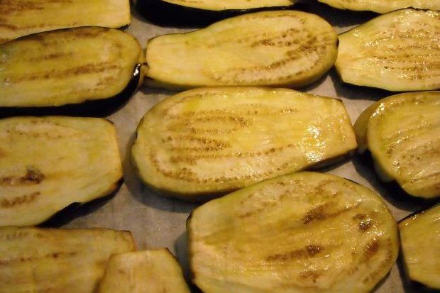 Πλένουμε τις μελιτζάνες κι αφαιρούμε μερικές λωρίδες από τη φλούδα τους. Τις κόβουμε σε φέτες του ενός περίπου εκατοστού, τις αλατίζουμε ελαφρά και τις αφήνουμε σε σουρωτήρι για μισή έως μια ώρα. Σκουπίζουμε καλά με χαρτί κουζίνας. Στη σχάρα του φούρνου τοποθετούμε χαρτί ψησίματος το αλείφουμε με ελάχιστο λάδι και αραδιάζουμε τις μελιτζάνες. Με πινέλο αλείφουμε τις μελιτζάνες με λάδι και τις βάζουμε στο φούρνο στο γκριλ για πέντε λεπτά. Γυρίζουμε τις μελιτζάνες και επαναλαμβάνουμε την ίδια διαδικασία.