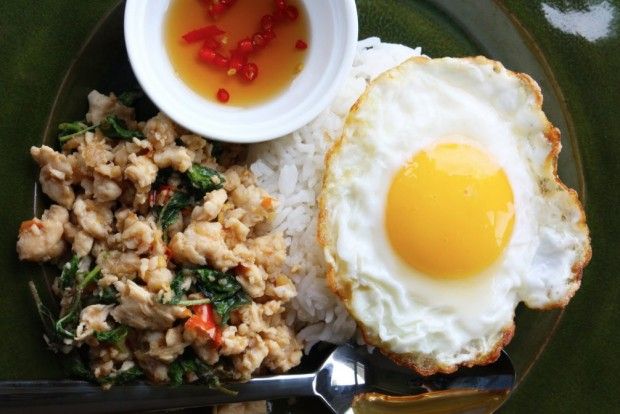 Ένα από τα πιο αγαπημένα μου είναι το Παντ Κρα Παο (Phant Kra Prow) που, όπως με πληροφορεί ο Τάι, ο νεαρός σερβιτόρος, θα πει “μαγειρευτό με δυόσμο ή βασιλικό” και είναι η πίτσα των Ταϊλανδών. Πίτσα; Καμία σχέση. Θέλει να πει ότι στην πατρίδα του είναι το πιο συνηθισμένο φαγητό, το φαγητό των φτωχών, το μαγειρεύουν παντού ακόμη και στον δρόμο σε διάφορες παραλλαγές, με κιμά, κομματάκια κοτόπουλου ή θαλασσινά, ό,τι έχουν πιο πρόχειρο δηλαδή και το σερβίρουν με ρύζι στον ατμό και απαραίτητα ένα αυγό μάτι στο πλάι.