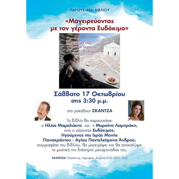 Το προσεχές Σάββατο, 17 Οκτωβρίου, στις 3:30 µ.µ., στο εστιατόριο “Σκάντζα” στην Κηφισιά θα παρουσιαστεί το βιβλίο «Μαγειρεύοντας με τον γέροντα Ευδόκιμο». Ο Ευδόκιμος, ηγούμενος της Μονής Παναχράντου στην Άνδρο, τρανός μάγειρας και συγγραφέας, είναι μια άκρως ενδιαφέρουσα, πολυσχιδής προσωπικότητα.
