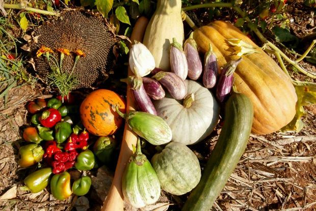 Μια τελευταία σοδειά από πράσινες, λευκές και τσακώνικες μελιτζάνες. Ποικιλία από κολοκύθες, πιπεριές και το ξεραμένο άνθος από ηλίανθο για τα ευεργετικά του σπόρια.
