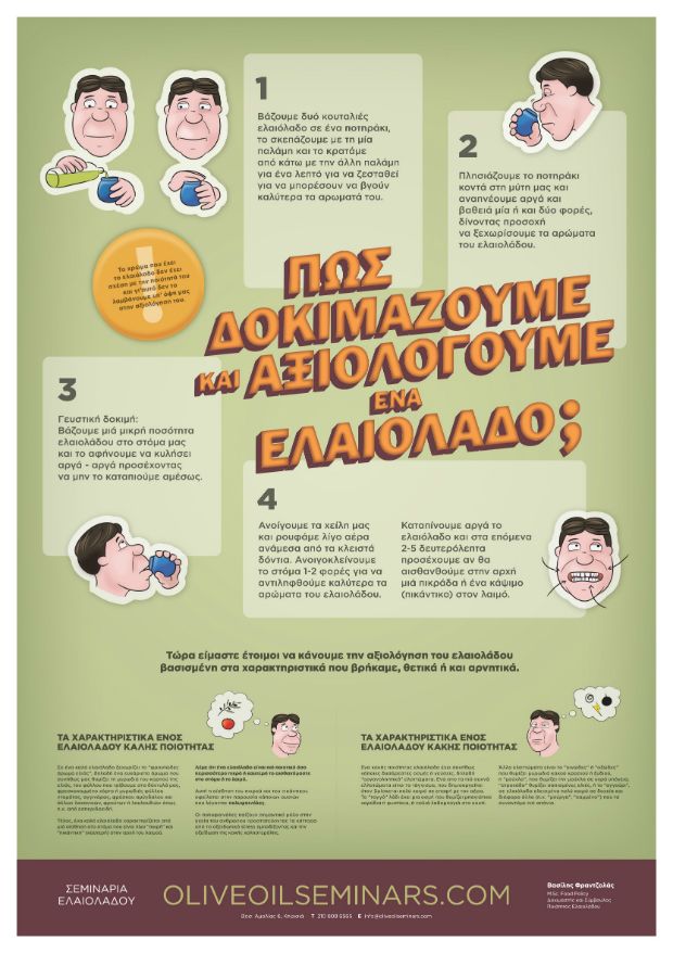 Πώς μαθαίναμε την κλίση των ανώμαλων ρημάτων σε χρόνια μαθητικά; Κάπως έτσι, μια υπενθύμιση των σωστών τεχνικών σχηματοποιημένη, με χαριτωμένο τρόπο, αλλά απολύτως έγκυρη και κατατοπιστική. Εργαλείο πολύτιμο για τους πρωτόπειρους στον χώρο του ελαιολάδου μα και τους ελαιοτριβείς. Η δε μακρύτερη, με τα χαρακτηριστικά ενός ελαιολάδου καλής ποιότητας, είναι πρώτης τάξης μπούσουλας για όσους δεν καλοξέρουμε να το ξεχωρίζουμε μα θέλουμε να μάθουμε να το διαλέγουμε.