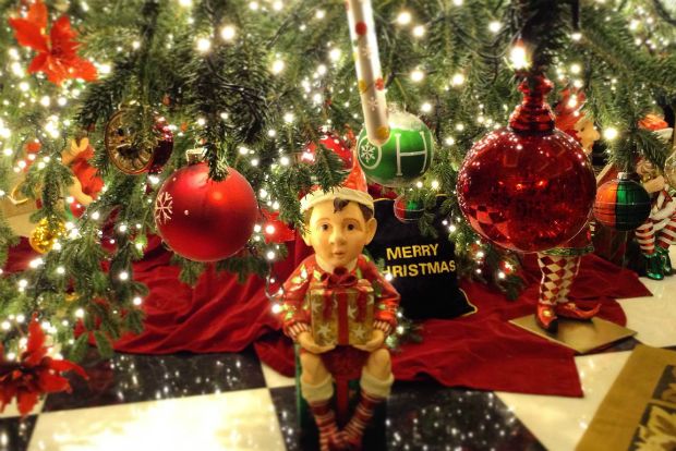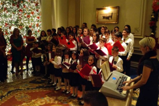 Πριν προλάβουμε να καλοκαταλάβουμε τι γίνεται, ένα εύθυμο βίντεο προβαλλόταν στον τοίχο πίσω μας δείχνοντας την ετοιμασία και τους στολισμούς του ξενοδοχείου για την περίοδο των γιορτών. Μετά από λίγο το ψηλό και φουντωτό δέντρο αποκαλύφθηκε στον χώρο του λόμπυ και η χορωδία ξεκίνησε, η ατμόσφαιρα ζεστάθηκε μεμιάς. Χάρμα! Στολισμένο με μεράκι, περίτεχνες γιρλάντες, στολίδια όλων των χρωμάτων και φωτάκια – πόσα φωτάκια! Είναι από εκείνες τις στιγμές που ξεχνιέσαι, χαζεύεις μαζί με τα πιτσιρίκια εκσταστιασμένος, από τη βάση ως την κορυφή, το γιορτινό δέντρο και νιώθεις λίγη από την περίφημη μαγεία των Χριστουγέννων.