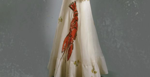 Το φόρεμα είναι φτιαγμένο από άσπρο μετάξι και έχει μια βυσσινο-κόκκινη ζώνη στη μέση. Ο αστακός σχεδιάστηκε από τον Σαλβατόρ Νταλί, που προσέθεσε και κλωναράκια από μαϊντανό εδώ κι εκεί. Το σχέδιο του Νταλί μεταφέρθηκε στο μεταξένιο ύφασμα από τον σχεδιαστή Ζάχε, που αργότερα συνεργάστηκε με κορυφαίους μόδιστρους και σχεδιαστές μόδας όπως ο Βάσκος Μπαλενσιάγκα.