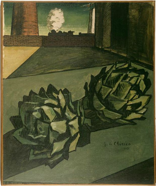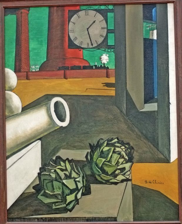 Οι αγκινάρες κάνουν την παρουσία τους και σε ένα ακόμη έργο της ίδιας περιόδου, τη «Μελαγχολία ενός απογεύματος», που ανήκει στην συλλογή του Κέντρου Πομπιντού στο Παρίσι. Διακρίνω έντονη αμφισημία στην παρουσία της αγκινάρας και στους δύο πίνακες, που συμβαδίζει με το μυστηριακό χαρακτήρα της σύνθεσης. Είναι το καλό και το κακό μαζί. Στο «Υπεράνω του καλού και του κακού» ο Νίτσε έγραφε (η απόδοση στα ελληνικά είναι δική μου): Αυτό που μια εποχή βιώνει σαν κακό, είναι συνήθως ένας άκαιρος αντίλαλος εκείνου που παλιά είχε βιωθεί σαν καλό – ο αταβισμός ενός αρχαίου ιδεατού.
