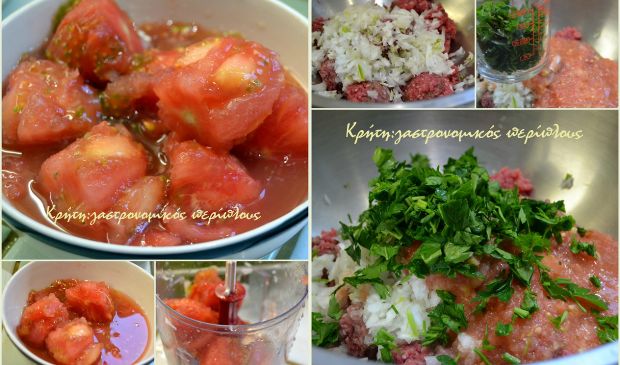 Αλέθουμε στο multi και το εσωτερικό από τις περισσότερες ντομάτες (τουλάχιστον 4) και το προσθέτουμε κι αυτό. Χωρίς το νερό βέβαια! Ψιλοκόβουμε στο μείγμα τα μυρωδικά και προσθέτουμε το ρύζι, αφού το ξεπλένουμε και αλατοπιπερώνουμε.