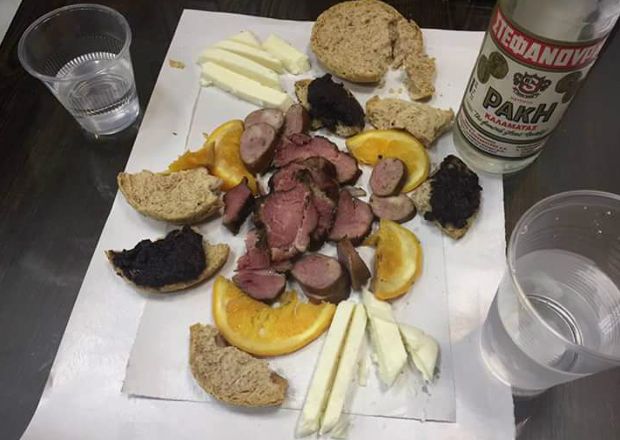 Μετά πήγα τις φίλες μου στου Οικονομάκου για λουκάνικο και παστό, συνοδεία με αρωματισμένο νερό από ρακί Καλαμών. Δοκιμάσαμε σφέλλα και παξιμάδι δυσεύρετο, εκτός από Ιθώμης 12 στην Καλαμάτα.