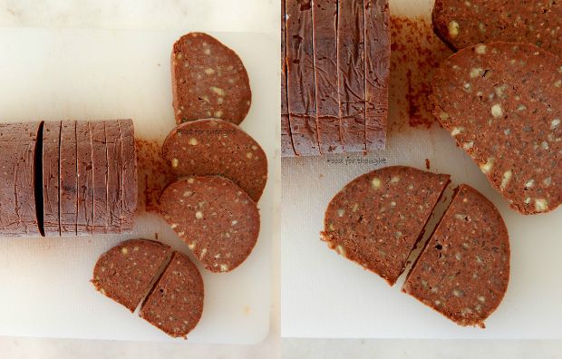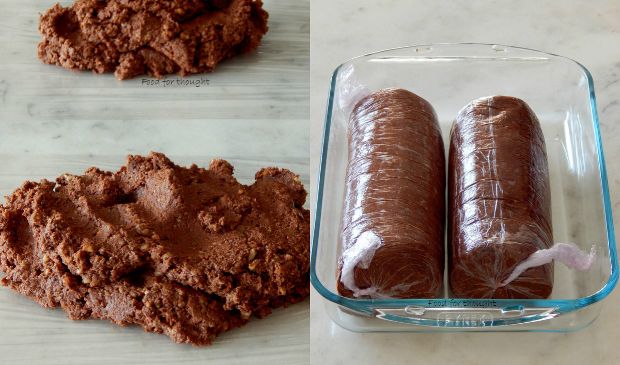 Σταματάμε το μίξερ. Προσθέτουμε στο μίγμα τα μπισκότα και χτυπάμε πάλι μέχρι να ενσωματωθούν και να έχουμε μια ζύμη αρκετά μαλακή. Σταματάμε πάλι το μίξερ και αυτή τη φορά ρίχνουμε μέσα στο μίγμα την καρυδόψιχα. Πλέον ανακατεύουμε με το χέρι μας, ζυμώνοντας πολύ καλά μέχρι να ενσωματωθούν τα καρύδια στη ζύμη. Η ζύμη θα εξακολουθεί να είναι πολύ μαλακή. Γι’ αυτό τον λόγο, καλό είναι το ανακάτεμα να το κάνουμε (αν διαθέτουμε) με γάντι μιας χρήσης. Βοηθάει για να μην κολλάει η ζύμη στα χέρια μας.