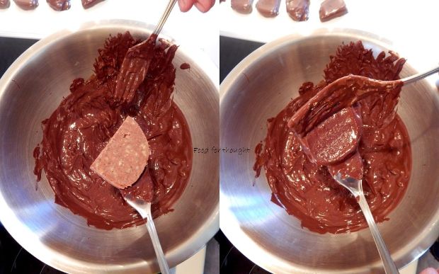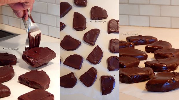 Βουτάμε μία – μία στη σοκολάτα και την καλύπτουμε γύρω γύρω με σοκολάτα. Τη διαδικασία αυτή την κάνουμε με τη βοήθεια δύο πιρουνιών. Επειδή θέλουμε μόνο να επικαλυφθούν, προσέχουμε στο πάνω μέρος τους να μη συγκρατήσουν μεγάλη ποσότητα σοκολάτας. Για το λόγο αυτό με το πιρούνι αφαιρούμε την περιττή ποσότητα «ξυρίζοντας» το πάνω μέρος της καριόκας όπως βλέπουμε στη φωτογραφία.