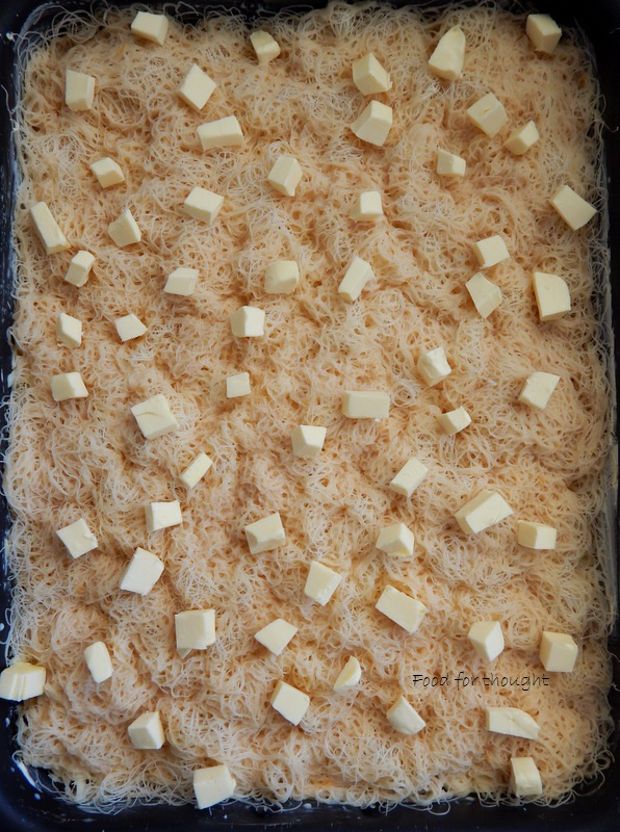 Τοποθετούμε το φύλλο καταΐφι στον πάγκο της κουζίνας μας και αρχίζουμε να το αφρατεύουμε. Θέλουμε να χωριστούν όλες οι κλωστές του μεταξύ τους και να «αναμαλλιαστεί». Πρέπει να διπλασιαστεί σε όγκο. Είναι μια διαδικασία εύκολη που θα πάρει λίγο χρόνο αλλά πρέπει να γίνει σωστά. Βουτυρώνουμε το ταψί.