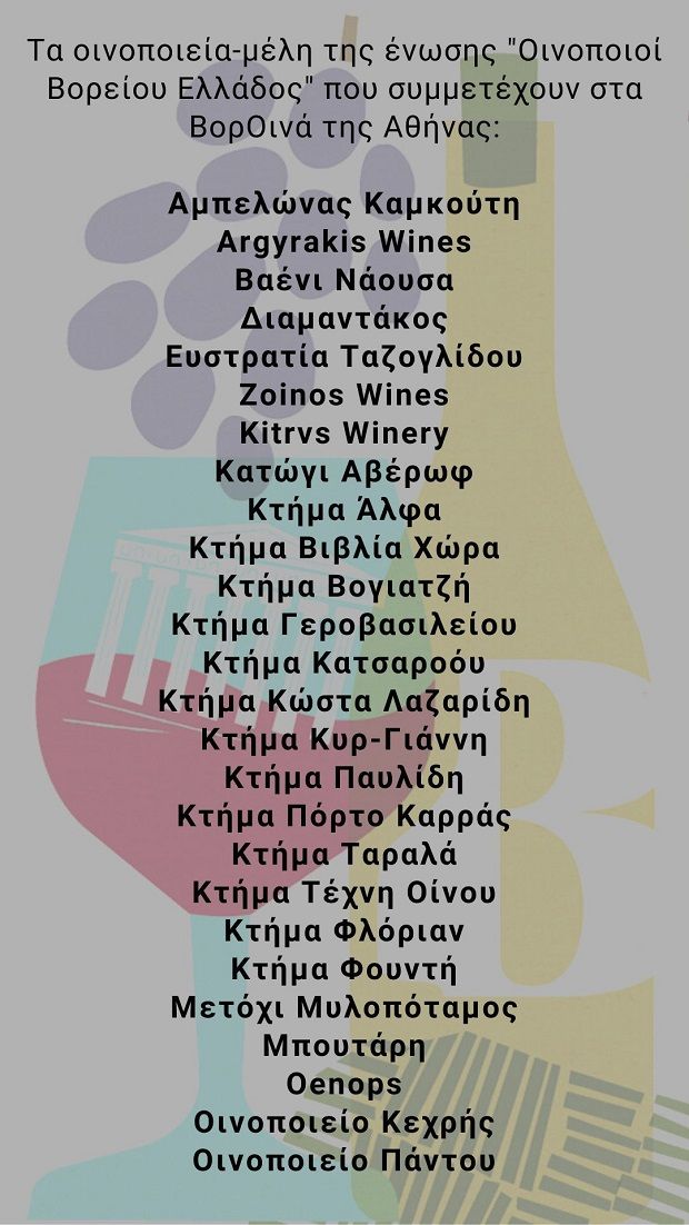 Tα θαυμαστά κρασιά και τα εξαίρετα αποστάγματα των Οινοποιών Βορείου Ελλάδος, που παράγονται σε όλη τη Μακεδονία, από τις πλαγιές του Ολύμπου και το πλατό του Αμυνταίου μέχρι τις βουνοκορφές της Πίνδου και από εκεί στους παραλίμνιους, παραθαλάσσιους και ορεινούς αμπελώνες της, παρουσιάζονται στην έκθεση ΒορΟινά της Αθήνας.