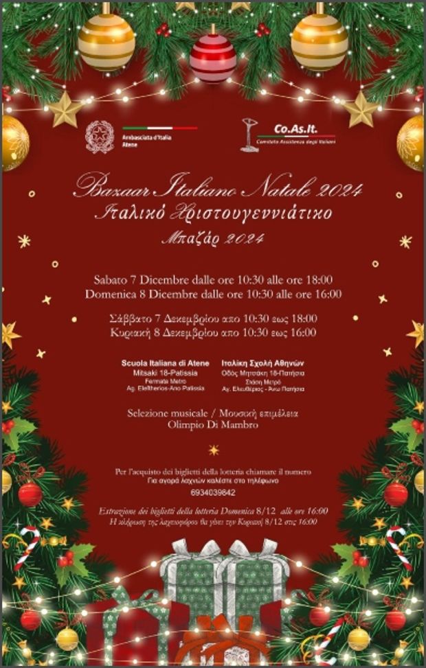 Το Σάββατο 7/12 και την Κυριακή 8/12 σας περιμένουμε στην Ιταλική Σχολή Μητσάκη 18, στα Πατήσια, στο Χριστουγεννιάτικο Bazaar του συλλόγου Co.As.It για την υποστήριξη Ιταλών υπηκόων στην Ελλάδα.