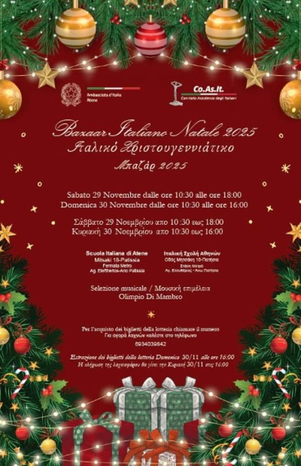Το Σάββατο 29/11 και την Κυριακή 30/11 ο Σύλλογος Αλληλοβοήθειας Ιταλών στην Ελλάδα (COASIT ) διοργανώνει το παραδοσιακό Χριστουγεννιάτικο Μπαζάρ του με εκλεκτά ιταλικά προϊόντα στην Ιταλική Σχολή Αθηνών, Μητσάκη 18 στα Πατήσια