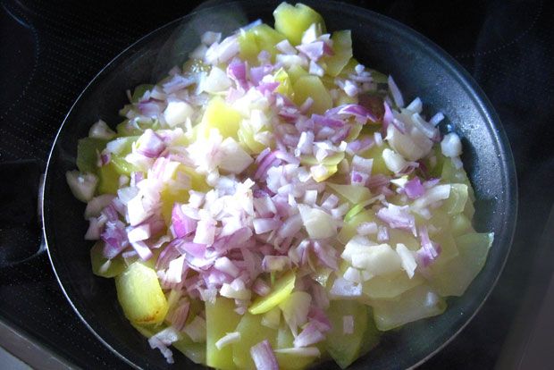 Οι Ισπανοί χωρίζονται σε δύο κατηγορίες: εκείνων που προτιμούν την τορτίγια με κρεμμύδι και εκείνων που την προτιμούν χωρίς. Εμείς την προτιμάμε με κρεμμύδι γι’ αυτό η συνταγή που ακολουθεί το περιλαμβάνει. Αν δεν σας αρέσει, παραλείψτε το.