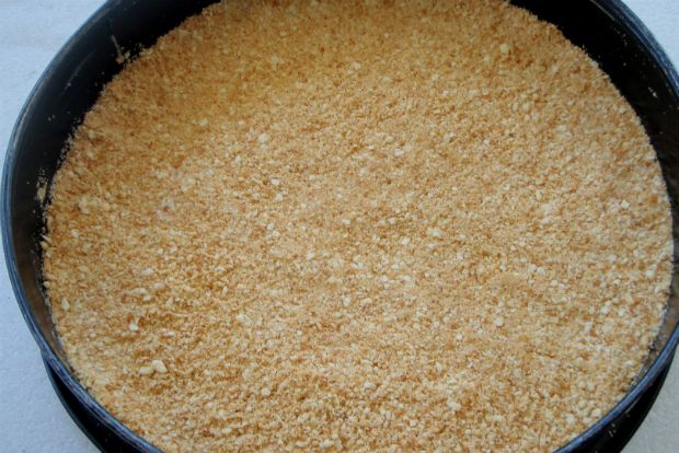 Θρυμματίζουμε τα κράκερς στο μούλτι, προσθέτουμε το βούτυρο και την παρμεζάνα, τα ανακατεύουμε μέχρι να ομογενοποιηθούν και τα στρώνουμε σε ένα στρογγυλό ταψί που ανοίγει από το πλάι με κλιπ. Ψήνουμε τη βάση σε προθερμασμένο φούρνο στους 180 – 200 °C για 8′-10′.