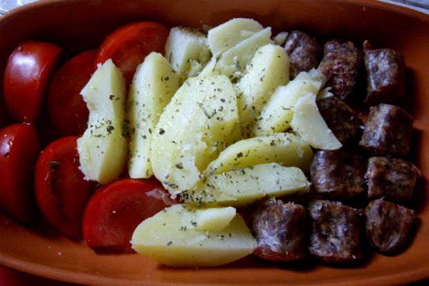 Μετά την επιστροφή μας από το κτήμα, κόβουμε το λουκάνικο σε κομμάτια ενός εκατοστού και τα αραδιάζουμε στη μια άκρη ενός πυρίμαχου σκεύους. Ξεφλουδίζουμε την πατάτα την κόβουμε σε κομμάτια που τα απλώνουμε στη μέση. Αραδιάζουμε τις ντομάτες μας στο άλλο άκρο. Αλατοπιπερερώνουμε κατά βούληση. Ψήνουμε σε προθερμασμένο φούρνο στους 200 βαθμούς για 15 λεπτά.