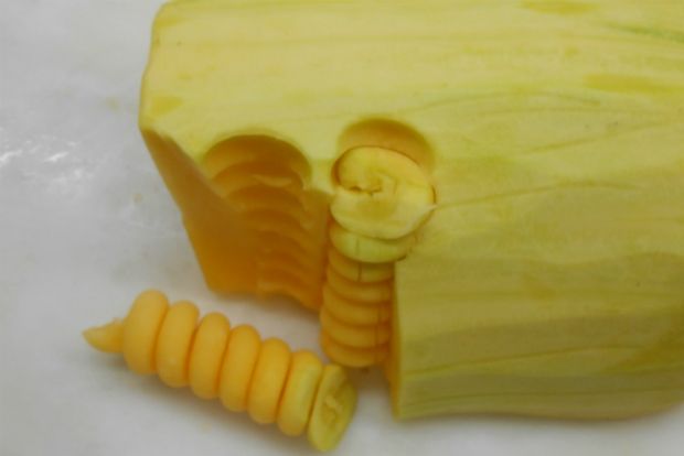 Χρησιμοποιήστε το κατάλληλο εργαλείο για την αρίδα, “βιδώνοντάς” το μέσα στη σάρκα της κολοκύθας (όπως ακριβώς βάζουμε το ανοιχτήρι στον φελλό του μπουκαλιού). Θα χρειαστεί να απελευθερώσετε τη σχηματισμένη αρίδα κόβοντας με ένα μαχαιράκι γύρω της το κολοκύθι. Προσέξτε ώστε να βγάλετε όσο το δυνατόν περισσότερα κομμάτια.