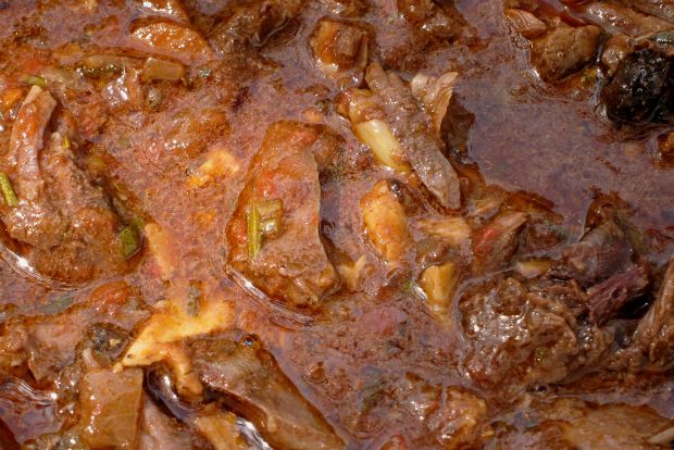 Ανακατέψτε τον πελτέ με το κρασί της μαρινάδας και προσθέστε τα στην κατσαρόλα μαζί και με το ξίδι. Όταν έρθουν σε βράση, προσθέστε τις ντομάτες και όταν βράσουν πάλι χαμηλώστε τη φωτιά όσο γίνεται (ίσα – ίσα να κινείται η επιφάνεια του υγρού). Αν η κατσαρόλα σας μπαίνει στο φούρνο μπορείτε εκεί να πετύχετε καλύτερα τη χαμηλή θερμοκρασία. Θέλει τρεισίμιση περίπου ώρες ώσπου το κρέας να πέφτει από τα κόκκαλα.