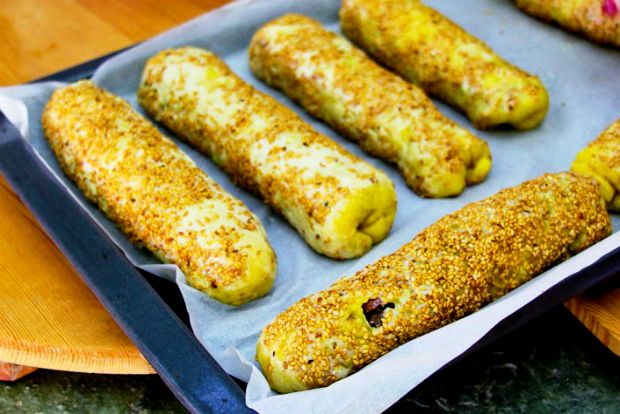 Με σπάτουλες και με τη βοήθεια του λαδόχαρτου μεταφέρετε το πρώτο ρολό σε λαμαρίνα και συνεχίστε με τα υπόλοιπα. Πασπαλίστε, αν θέλετε, με σουσάμι.