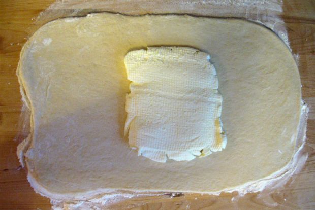 Παίρνετε τη ζύμη από το ψυγείο και την ανοίγετε σε ένα χοντρό παραλληλόγραμμο φύλλο, μεγαλύτερο από το παραλληλόγραμμο του βουτύρου. Βγάζετε και το βούτυρο από τα αντικολλητικά χαρτιά και το βάζετε στη μέση του φύλλου της ζύμης.