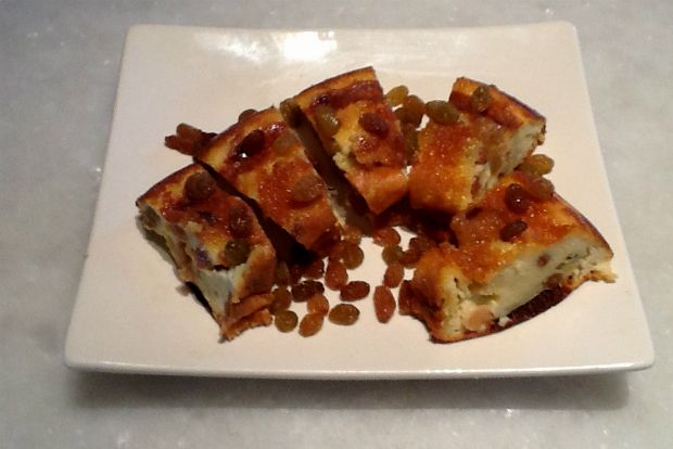 Μακριά από τη φωτιά, προσθέτουμε τα κροκάδια των αβγών ένα ένα, ανακατεύοντας καλά το μίγμα κάθε φορά. Προσθέτουμε τώρα τις σταφίδες που είχαμε βουτήξει στο ρούμι. Επιμελές ανακάτεμα και πάλι. Τελευταία φροντίδα η εισαγωγή της μαρέγκας μας με τις γνωστές ελαφριές ανακινήσεις που την διπλώνουν μέσα στο γλύκισμα. Μεταφορά στη φόρμα που έχουμε ντύσει με την ελαφριά καραμέλα, και, ωπ, στον φούρνο για τρία τέταρτα της ώρας περίπου.