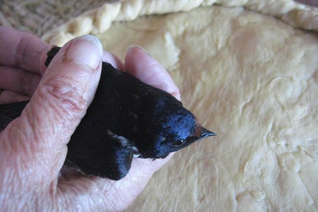 Είχαμε αποφασίσει ότι, παρόλο που φτιάχναμε την παραδοσιακή συνταγή, θα παραλείψουμε, για πολλούς λόγους, τα ολόκληρα πουλάκια. Την ώρα λοιπόν που μαγειρεύαμε, μπαίνει από την ανοιχτή πόρτα το κήπου και κάθεται πάνω στη φόρμα της πίτας ένα… κοτσύφι! Μας έπιασαν τα γέλια και θυμηθήκαμε το περίφημο nursery rhyme που παραθέτω κάτω από το τίτλο. Πριν απελευθερώσουμε το κοτσύφι, το αποθανατίσαμε.