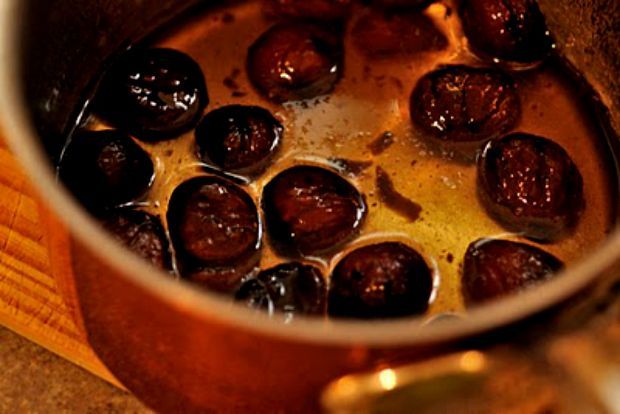 Της εποχής είναι τα γλυκά κάστανα σε σιρόπι και αλκοόλ, που φιλεύω τους φίλους μου τα τελευταία χρόνια. Κάνω μια παγαποντιά ωστόσο, ενισχύοντας τον αγαπημένο μου καστανά. Επειδή δυσκολεύομαι πολύ να ξεφλουδίσω σωστά τα κάστανα όσες φορές τα ψήνω μόνη μου, του τα παραγγέλνω και τα παίρνω έτοιμα και συνεχίζω περαιτέρω.