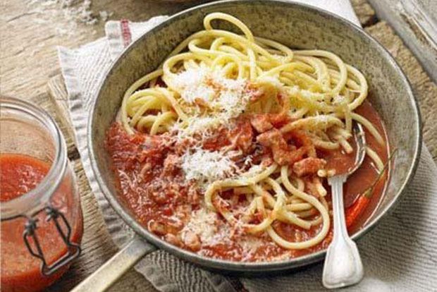 Ετοιμάζουμε τη σάλτσα: Κρεμμύδι και μπέικον πέφτουν σε ζεστό βαθύ τηγάνι με το λάδι, προστίθεται το σκόρδο, το ελάχιστο της πιπερίτσας. Όλα ανακατεύονται μέχρις ότου το κρεμμύδι γίνει διάφανο αρχικά και μετά αρχίσει να χρυσίσει. Επ’ ουδενί δεν το τσιγαρίζουμε και αν τυχόν το κάψουμε, αρχίζουμε τη διαδικασία από την αρχή!