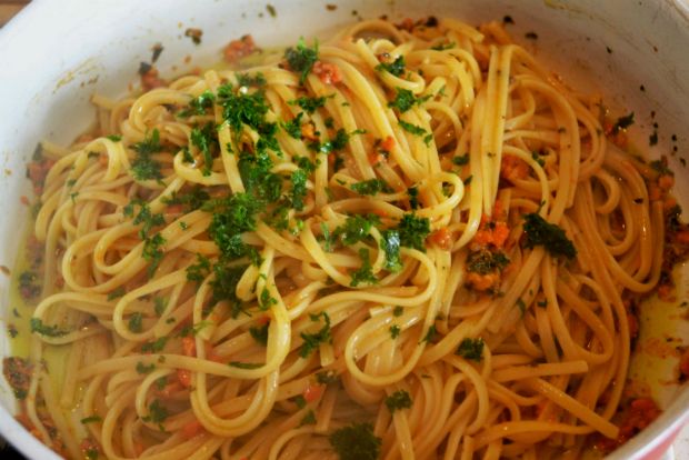 Όχι, τους θέλω παρθένους κατά το δυνατόν. Πασπαλίζω με τον μαϊντανό και μέσα στο βαθύ τηγάνι ρίχνω τα σουρωμένα μακαρόνια. Δυο βόλτες, ίσα να γνωριστούν και να ενωθούν.