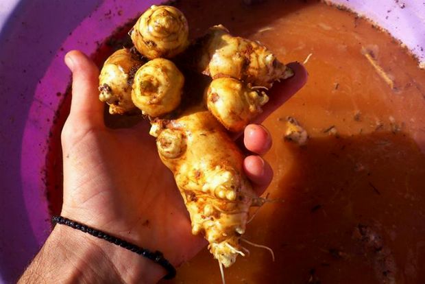 Το φθινόπωρο, όταν ξεραθεί το φυτό, μπορούμε να ξεριζώσουμε τους βολβούς του για να τους καταναλώσουμε. Από τη στιγμή που θα τους βγάλουμε από το έδαφος, θα διατηρηθούν ως και μία εβδομάδα προτού χαλάσουν. Επομένως είναι σοφό να κλαδέψουμε το πάνω τμήμα του φυτού, διατηρώντας το χαμηλότερο κομμάτι ως «σημαδούρα». Σκοπός μας είναι να συλλέγουμε κάθε φορά μόνο όσους βολβούς πρόκειται να καταναλώσουμε, διατηρώντας τους υπόλοιπους φρέσκους στο έδαφος. Ακόμα, όσο παραμένουν στο χώμα, με την πάροδο του χρόνου γλυκαίνουν και έχουν πιο νόστιμη γεύση, ιδιαίτερα σε κήπους σε βόρειες περιοχές που οι θερμοκρασίες είναι χαμηλότερες.