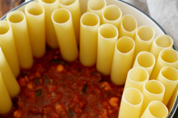 Ετοιμάζουμε την κόκκινη σάλτσα που θα είναι η βάση της μακαρονάδας μας – όταν λέω βάση κυριολεκτώ. Εκεί μέσα θα ακουμπήσουν όρθια τα κανελόνια. Ζεσταίνουμε το λάδι σε κατσαρόλα μεγάλη, προσθέτουμε το δαφνόφυλλο, την κανέλα, τις πιπερίτσες, τα κρεμμύδια και τελευταίο το λιωμένο σκόρδο. Σωτάρουμε για λίγο ίσα να γίνουν διαφανή τα κρεμμύδια. Τότε, προσθέτουμε τα καρότα, τα μανιτάρια, τα ρεβίθια και όλα τα αρωματικά. Σωτάρουμε για 5 λεπτά, ανακατεύοντας, κι έπειτα χαμηλώνουμε τη φωτιά και ρίχνουμε τα ντοματάκια με τον ζωμό τους (κομμένα βέβαια), τον ζωμό των λαχανικών και το κρασί. Αλάτι και πιπέρι. Κλείνουμε το καπάκι και αφήνουμε να σιγοβράσει για 20 λεπτά, ανακατεύοντας πού και πού για να μη πιάσει η κατσαρόλα (σ’ αυτήν την περίπτωση ρίχνουμε λίγο ζεστό νερό).