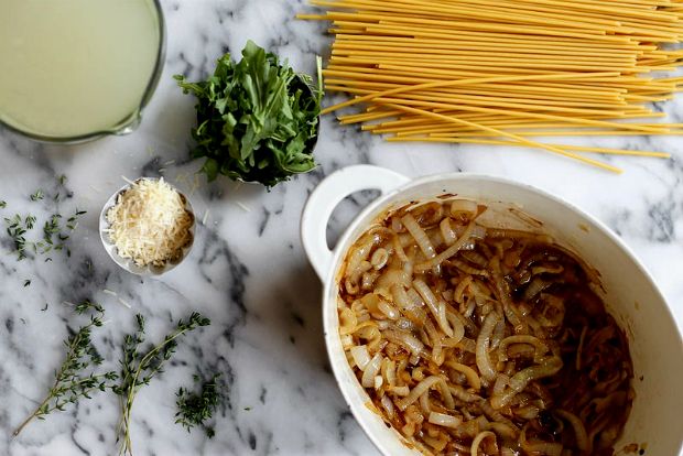 Το ‘χω ξαναπεί ότι απολαμβάνω, λίγο μαζοχιστικά είναι η αλήθεια, τις δραστηριότητες που η επιτυχία τους ή η καταστροφή τους εξαρτώνται από ένα, άντε δύο τσακ. Η μαγειρική σου προσφέρει πολλές τέτοιες εναγώνιες χαρές. Το κόψιμο της μαγιονέζας, λόγου χάριν, ή το κάψιμο των κρεμμυδιών. Έτσι όμως και δεν καούν τα κρεμμύδια, έτσι και γλυκοροδίζουν μέσα σε μίγμα ελαιόλαδου και βούτυρου, για κλείστε τα μάτια και θυμηθείτε ή φαντασθείτε τι ανακουφιστική και μαζί γαργαλιστική μυρωδιά φέρνουν. Εκεί ποντάρει τούτη η μακαρονάδα. Είναι λίγο της υπομονής (τα κρεμμύδια για να σιγοροδίσουν), χρειάζονται τον διπλό χρόνο από τον βρασμό των μακαρονιών αλλά νομίζω θα σας μείνει αξέχαστη.