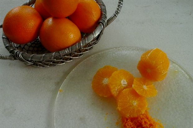 Ζεσταίνουμε τον φούρνο στους 180 °C. Παίρνουμε το ξύσμα από τα δύο πορτοκάλια. Κόβουμε σε ωραίες στρογγυλές φέτες τα πορτοκάλια, αφού τα έχουμε ξεφλουδίσει καλά.