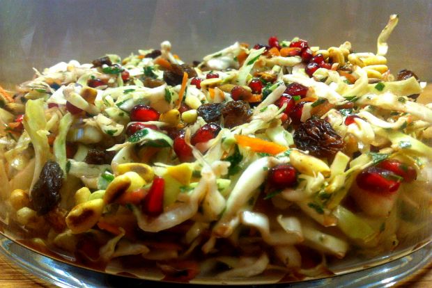Ψιλοκόβω το λάχανο και το καρότο και τα ανακατεύω σε ένα μεγάλο μπολ με τα καβουρντισμένα κουκουνάρια, τις σταφίδες και τα σπόρια από 2 ρόδια.