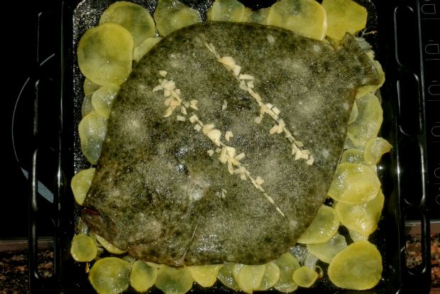 Η άλλη συνταγή είναι ισπανική: Rodaballo al horno, με το ψάρι χαραγμένο και ψημένο στο φούρνο πάνω σ’ ένα στρώμα από πατάτες και κρεμμύδια. Αυτήν επέλεξα τελικά (κυρίως γιατί δεν μου έκανε καρδιά να κομματιάσω το ψάρι) και δεν μετάνιωσα. Αν την ξαναέφτιαχνα, νομίζω θα ανακάτευα το σκόρδο με τις πατάτες και τα κρεμμύδια και δεν θα το έβαζα πάνω στο ψάρι. Το λεμόνι στις πατάτες είναι δική μου, ελληνική προσθήκη. Οι ισπανοί ποτέ δεν χρησιμοποιούν λεμόνι στη μαγειρική. Όσο για τον ζωμό, εγώ φυλάω πάντα στην κατάψυξη για να έχω για παέγια, αλλά και ζωμός λαχανικών ή σκέτο νεράκι κάνει μια χαρά.