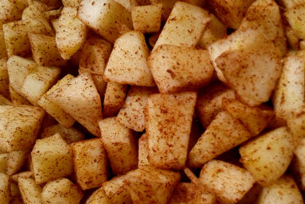 Καθαρίζουμε τα μήλα και τα κόβουμε σε κύβους.