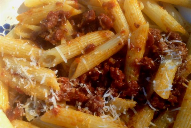 Η αρχική ιταλική συνταγή (της «δασκάλας» μου, Μαρτσέλας, βέβαια) είναι με απλό λουκάνικο και ψιλοκομμένη καυτερή πιπεριά. Εκείνη συστήνει ριγκατόνι αλλά η σάλτσα ταιριάζει με οποιοδήποτε κοντό ζυμαρικό: βίδες, αχιβάδες, μακαρονάκι κοφτό κλπ.