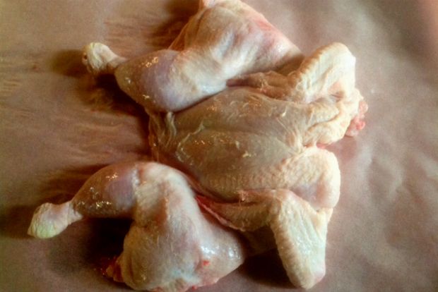 Η προετοιμασία του είναι απλή: με κοφτερό ψαλίδι πουλερικών το κόβετε στη γραμμή της ραχοκοκαλιάς (ποτέ του στέρνου!) και το ανοίγετε σαν βιβλίο (ή “πεταλούδα”, ο διεθνής όρος είναι butterflied). Με το ανοιχτό μέρος προς τα κάτω το χτυπάτε μερικές φορές (ιδίως στις κλειδώσεις) με τον μουστά-μπάτη (έτσι λέγεται το εργαλείο κουζίνας που έχουμε για να χτυπάμε το κρέας, το ξέρατε; Κι εγώ τώρα το έμαθα!) ή κάτι άλλο βαρύ… ένα μπουκάλι λάδι, ας πούμε. Με το χτύπημα το κάνουμε πιο ομοιόμορφα επίπεδο για να ψηθεί εξίσου παντού.